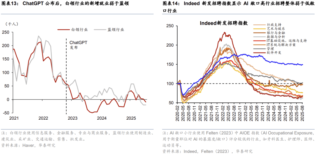 我们认为,AI或对部分行业/群体就业带来冲击,但目前还不是就业放缓的最重要原因。根据Felten(2023)研究[5],非农就业中有19个行业中对AI技术(特别是语言模型)敞口较高,我们将非农就业分为两部分,对AI敞口高的行业和其他,两者分别占就业的11%和89%。2022年11月ChatGPT公布后,部分对AI敞口高的行业在2024-2025年出现下降趋势,如商业与计算机培训、商务支持等(图表9),说明AI的确导致部分行业就业需求下降。但整体来看,AI可能不是就业需求放缓的最重要原因。例如,AI敞口较高行业新增非农就业趋势好于其他行业(图表10)。此外,与2024年下半年相比,2025年5-7月就业放缓较多的行业是休闲酒店、建筑业、批发业、教育保健、商业服务业,除商业服务以来,多数行业与AI的相关度并不高(图表11)。此外,AI渗透影响较大的行业薪资增长边际放缓,但暂未比其他行业放缓更快(图表12)。
