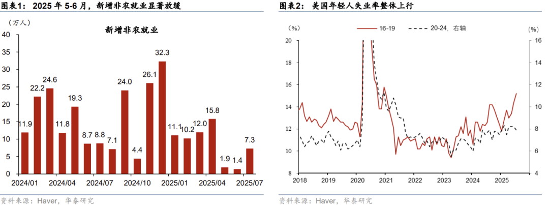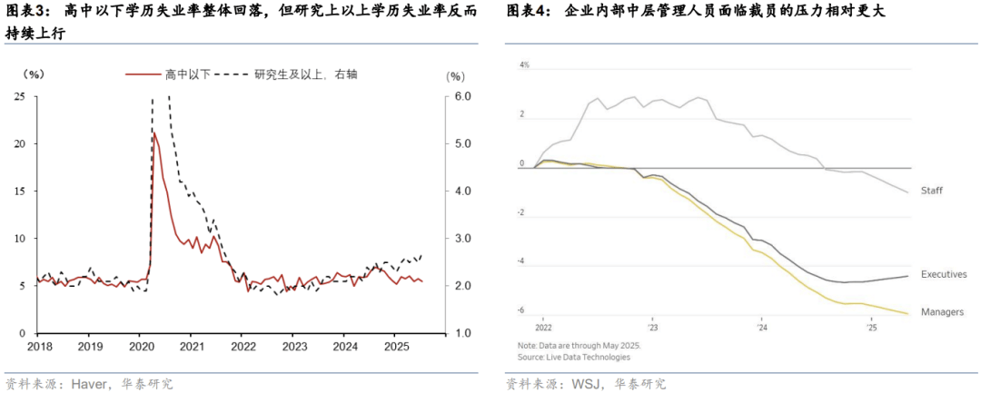2025年4月以来,美国就业明显放缓,年轻群体和研究生学历受冲击相对更大。2025年1-4月美国新增非农就业平均为12.3万,但5-6月放缓至1-2万,7月虽然小幅回升,但仅为7.3万(图表1)。虽然整体失业率维持在4%-4.2%的区间窄幅波动,但是年轻群体以及部分高学历就业受到的冲击相对更大。例如,16-19岁以及20-24岁的年轻人失业率持续上行,前者在7月达到15.2%,后者为7.9%(图表2);从教育背景来看,高中以下学历失业率整体回落,但研究上以上学历失业率反而持续上行(图表3)。此外,企业内部中层管理人员面临裁员的压力相对更大。根Live Data Technologies的数据,2023年以来美国上市公司中层管理人员数量下降6.1%,而高管和普通员工仅下降4.6%和1%(图表4)。中层管理人员数量被削减导致公司管理更加扁平化,但也意味着中层管理人员需要面对更多普通员工。人力资源软件提供商Lattice的数据显示,2020年中层管理人员平均有4.2名下属,2023年上升到5.1名。