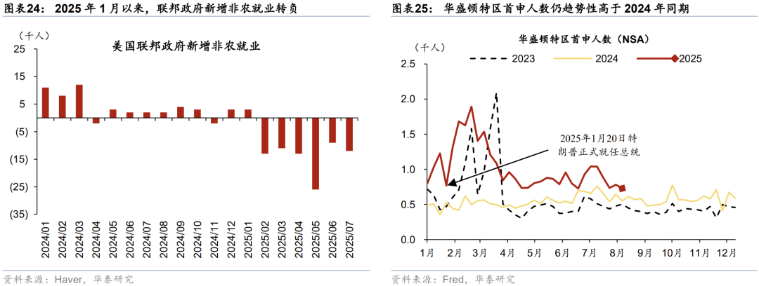 年初DOGE精简联邦机构,导致联邦政府就业明显走弱。特朗普就任后,成立DOGE以削减政府人员和开始,虽然在马斯克脱离该机构后,DOGE的行动出现明显放缓,但仍对上半年美国联邦政府就业造成明显拖累。2025年1-7月,联邦政府新增非农就业共计-8.4万人,而2024年联邦政府就业整体为正增长(图表24)。2-3月华盛顿特区的首申人数出现明显跃升,虽然4月以来呈现放缓迹象,但仍趋势性的高于2024年(图表25)。根据我们在《DOGE:降费增效能否如愿?》(2025/4/1)中的估算,受DOGE行动影响的政府雇员规模在10万人以上,而DOGE削减开支效果虽不明显,但其取消政府合约、冻结支出等行为拖累为联邦政府工作的私人承包商的投资和雇佣意愿,并带来经济和政策环境的不确定性,非线性地影响就业市场。