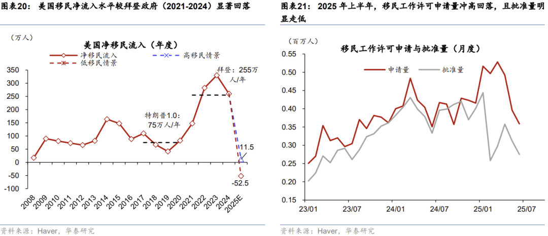 此外,移民流入放缓降低美国劳动供给,压低新增非农就业。一方面,特朗普就任以来,移民流入大幅放缓。2022-2024年美国每年移民净流入290万人,但是特朗普就任以来收紧边境管控,美国西南边境遭遇人数已在2025年7月回落至0.7万人/月,较2022-2024年的18.8万人/月明显回落,我们预计2025年移民流入可能放缓至0附近(图表20,参见《移民收紧或大幅压低美国“均衡”新增非农水平》,2025/8/10)。移民流入下降会降低美国劳动供给,从而拖累新增非农就业。不过,由于此前进入美国的非法移民在2025年上半年集中申请工作签证(图表21),一定程度上对冲了移民流入放缓带来的供给收缩。下半年,该效应褪去后,劳动力市场供给下降速度或明显加快。另一方面,2025年5月以来,驱逐非法移民加速,将会对就业市场带来进一步扰动。5月以来,美国执法机构加速对境内非法移民的驱逐行动,6月ICE的日均驱逐数由2025年1-5月的589人升至900人以上(图表22)。而7月4日签署通过的“大而美”法案为驱逐加速提供预算支持,法案一次性拨款1707亿美元,使得执法机构的年度预算提高5-6成(图表23)。虽然按照6月的驱逐速度,每月驱逐规模在2-3万人,即使考虑到后续加速,也和特朗普政府设定的每年100万人的目标可能有差距。不过,驱逐行动也会带来一定的“寒蝉效应”,在更加严格的政策环境下,非法移民参与就业市场的意愿也将受到压制。
