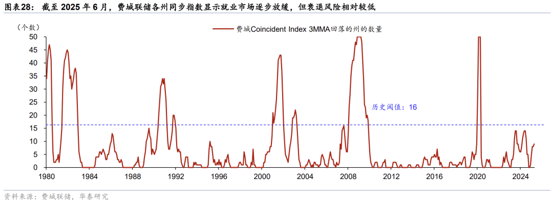 州层面就业指标显示,美国就业市场有所放缓,但衰退风险不高。从失业率占比来看,2025年以来,失业率在4-5%的中高区间的州占比有所上升(图表26)。从各州失业率扩散指数来看,虽然在2025年一季度明显走高,但二季度出现回落,显示就业市场一季度受到关税的冲击,但整体仍有一定韧性,全国层面失业率大幅回升的风险可控(图表27)。从费城联储州就业同步指数[7]来看,2025年以来该指数逐步上行,但截至6月仅为9,仍未超过阈值(16)(图表28)。